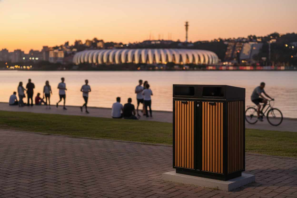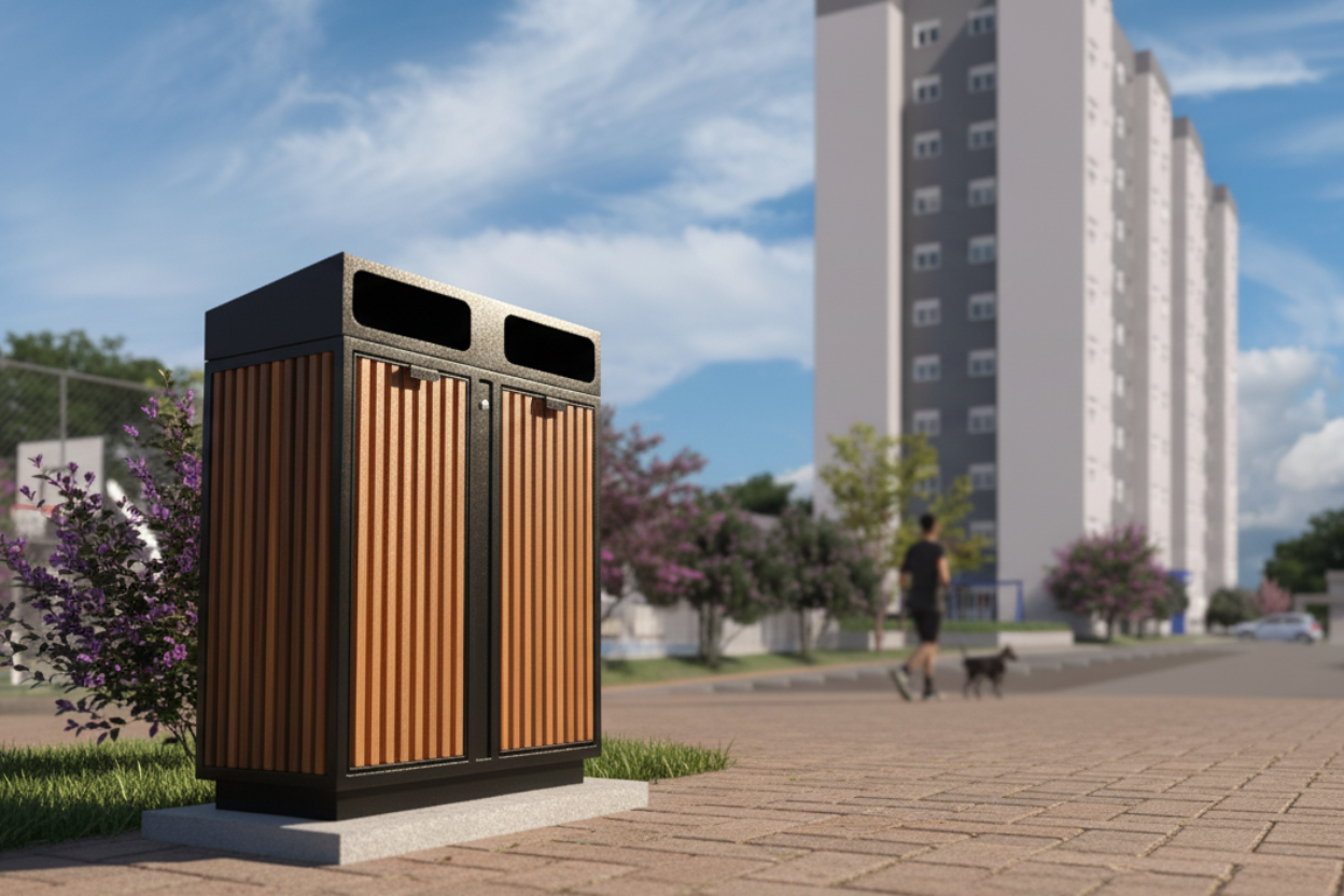 Com design sofisticado e resistente, a Lixeira Urbana Duo Madeira & Aço combina estrutura metálica robusta com painéis de madeira natural, trazendo elegância e funcionalidade aos espaços externos.