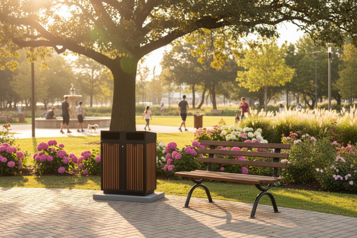 Seu visual moderno, com linhas verticais marcantes e acabamento em madeira natural, harmoniza perfeitamente com ambientes urbanos, corporativos e paisagísticos, tornando o mobiliário uma peça de destaque no espaço.