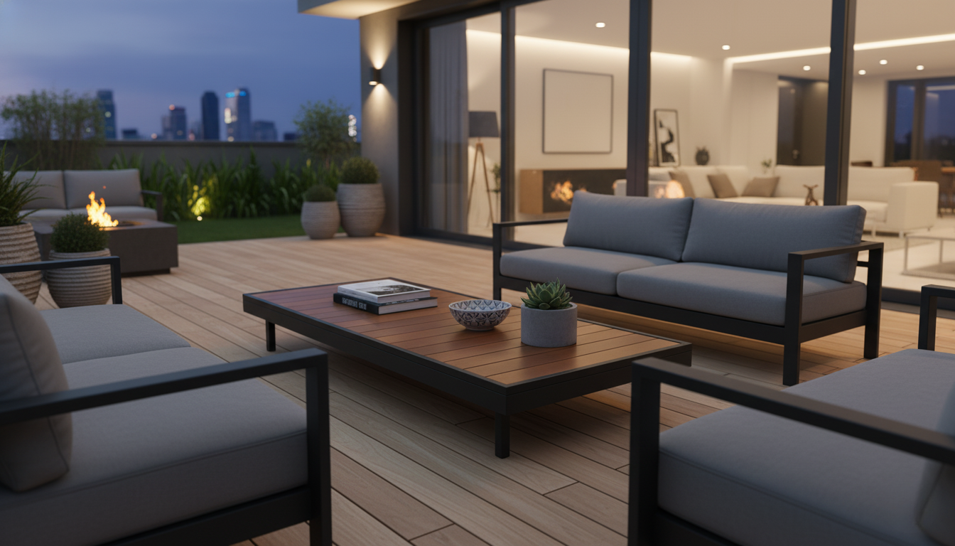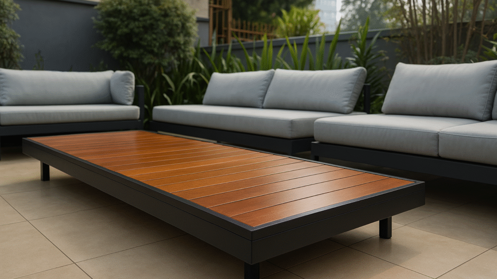 A Mesa de Centro Madeira & Aço combina design minimalista, resistência e elegância, ideal para compor ambientes externos sofisticados, como varandas, terraços e áreas de lazer.